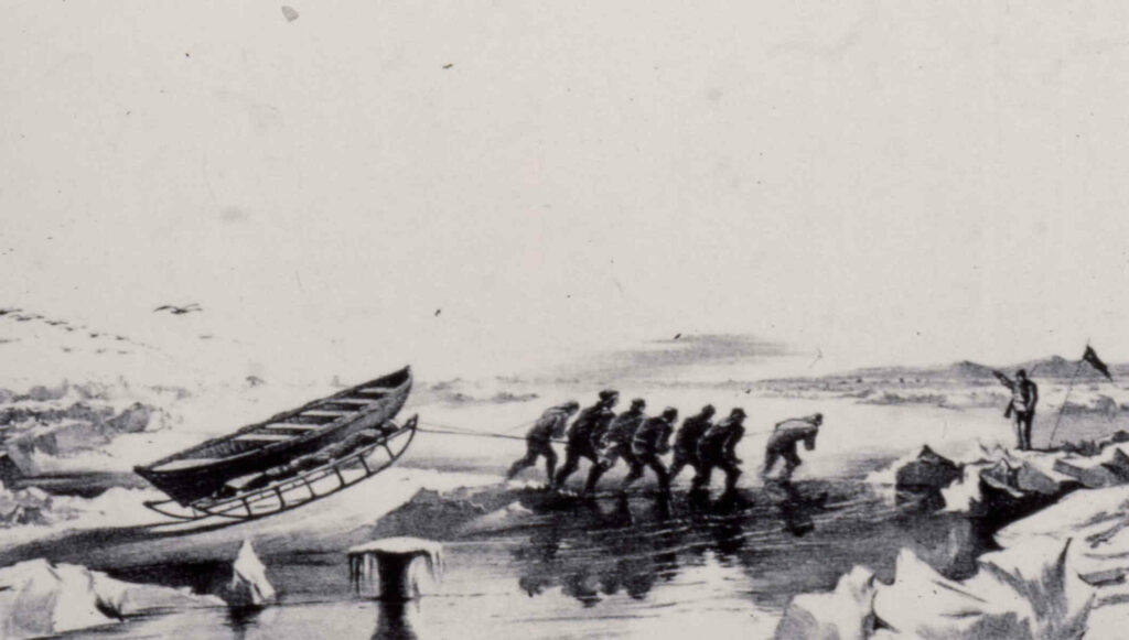 CUTTING A DOCK: When the ships reached a destination the men would cut docks in the relatively stable ice that had formed along a shore. The ice-quartermasters would measure the area needed while others rigged the saw triangles. As soon as the outline was finished teams of men set up their triangles along the edges. When ready each team split their men further: several men pulled down on the ropes hanging down from one side of their triangle’s pulley. Alternating with them, others pushed down on the handles near the top of the saw. (This image shows only one man doing this but there were usually at least 2 men doing this.) The three men who had the job of moving their triangle’s legs had to move them at the exact same time and for the exact same distance. If they didn’t their saw could buckle or even break. If it broke the team gave the member they thought was responsible for this the difficult task of getting the saw end out of the ice while the rest of them set up a replacement. The most skilled AND fortunate teams managed to avoid this problem altogether! While the edges were being cut other men laid out charges (Bickford fuses). As soon as the edges were finished these fuses were lit which caused the ice to break into separate chunks all the way out to the newly cut edges. Then the fun began! Everyone grabbed whatever they could find to pry the blocks out. As was usual amongst these strong-hearted men, they made a game of the sawing, racing each other to finish their section first, then competed to see who could pry out the most blocks.AUTUMN SLEDGING: In the autumn of 1852 the men of the Belcher Expedition undertook a relatively new innovation in Arctic exploration. This was instigated by Frances Leopold McClintock, the officer in charge of Resolute’s steam-tender Intrepid. After the Resolutes and Intrepids secured their ships in their new docks they loaded their sledges with supplies and set off to create cairns to house these provisions. This gave them the advantage of being able to go that much farther during the following spring as they searched for the Franklin men and the rescuers the Admiralty had previously sent out on HMS Enterprise (Captain Collinson) and Investigator (Captain McClure).During the autumn sledging, and again during the following spring an summer sledging seasons, the men took all the gear with them they would need en route: tents, cooking pots and food, sleeping bags and a change of clothing. One of the youngsters on Resolute, Mate Richard Roche, kept a private journal. In it he explained the gear they men took with them, disclosing that a change of underwear was optional, and rarely done! The sledging was arduous work. It may seem that summer sledging would be easier, but this was not really the case. They had to travel with boats they could use as the snow and ice melted. Sometimes their sledges broke through the remaining ice, and the men were soaked up to their waists with freezing water as they trudged onward. This more difficult terrain included spring runoff streams they had to ford, ice-water pools they had to skirt, camps they had to set up where they hoped the runoff wouldn’t break through, clothes and bedding that never seemed to dry out. All the while they searched for any signs of their brothers who had seemingly disappeared without a trace. Fortunately the Resolutes and Intrepids had some success: they found a message during their 1852 autumn sledging that indicated where the Investigator was locked in the ice. McClure had rushed into the Arctic from the west in 1850, without the assistance of the men on Enterprise. By doing so he put the lives of his officers and men at risk. When they became ice bound for a couple years there was no one who could raise the alarm or help them get out. There was a reason the Admiralty sent explorers out with at least 2 ships in company. McClure’s men suffered the consequences of McClure’s haste. Why was he rushing? Was it to find the Franklin Expedition? Or was he more interested in the glory of finding the Northwest Passage before anyone else did? By the time the Resolutes and Intrepids rescued them in the spring of 1853 the Investigators had been on starvation rations for a long time.